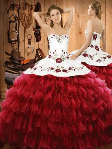 Floor Length Lace Up Sweet 16 Dresses Wine Red for Military Ball and Sweet 16 and Quinceanera with Embroidery and Ruffled Layers