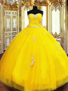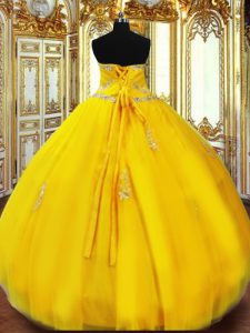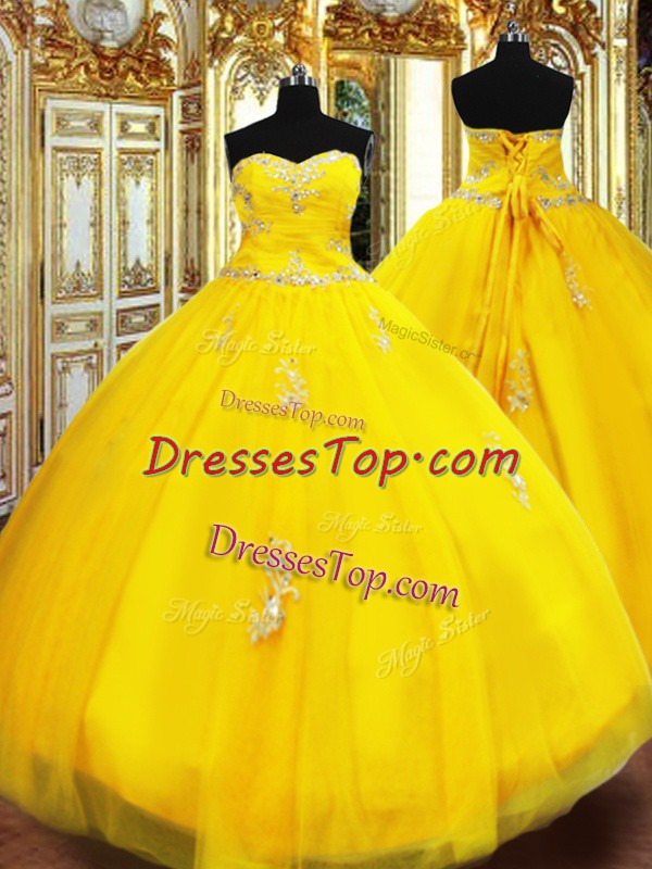 Floor Length Lace Up Sweet 16 Quinceanera Dress Gold for Military Ball and Sweet 16 and Quinceanera with Beading and Appliques