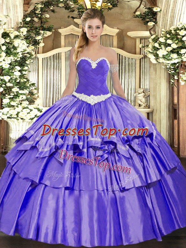 Floor Length Lace Up Sweet 16 Quinceanera Dress Lavender for Military Ball and Sweet 16 and Quinceanera with Appliques and Ruffled Layers