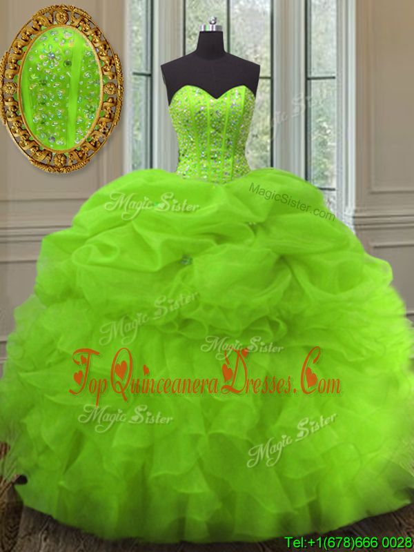 Green Lace Up Vestidos de Quinceanera Beading and Ruffles and Pick Ups Sleeveless Floor Length