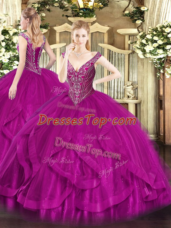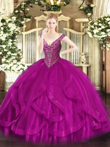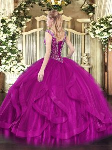 Floor Length Lace Up Vestidos de Quinceanera Fuchsia for Military Ball and Sweet 16 and Quinceanera with Beading and Ruffles