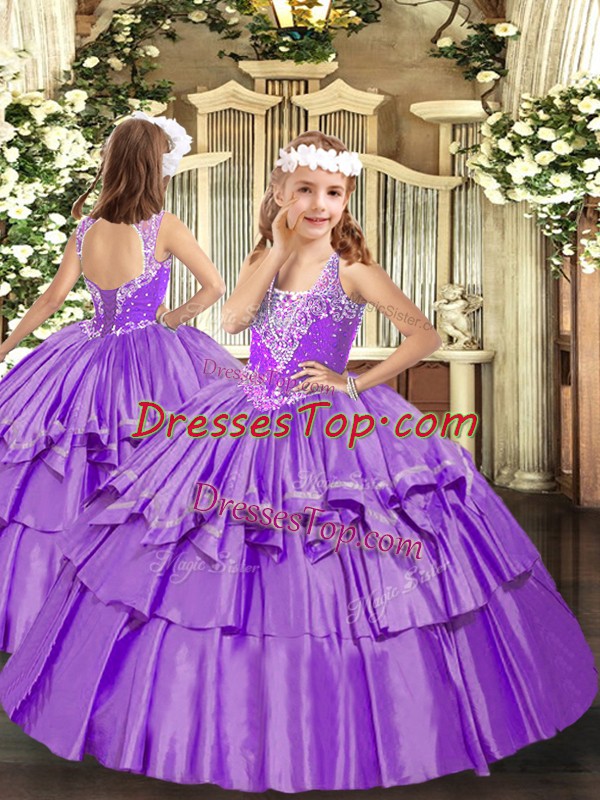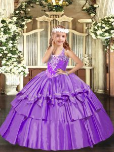 Floor Length Lavender Girls Pageant Dresses Organza Sleeveless Beading and Ruffled Layers