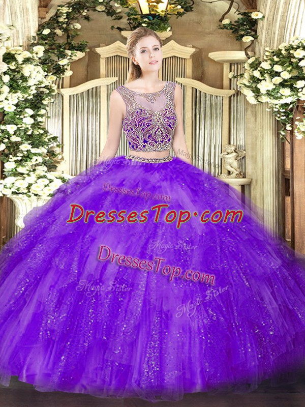 Floor Length Lavender Quinceanera Gown Tulle Sleeveless Beading and Ruffles