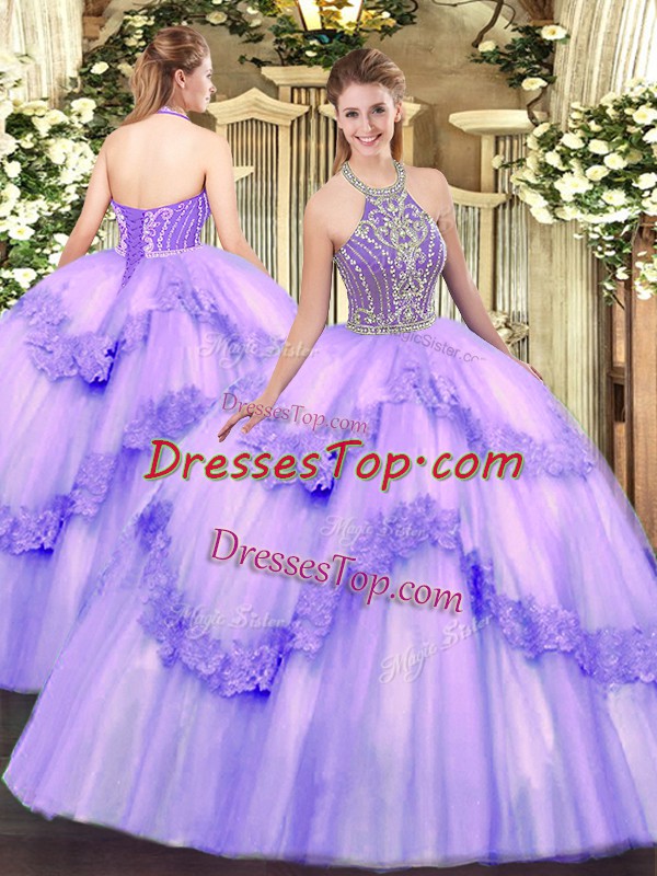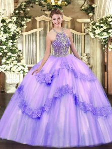 Floor Length Lavender Quinceanera Gowns Tulle Sleeveless Beading and Appliques