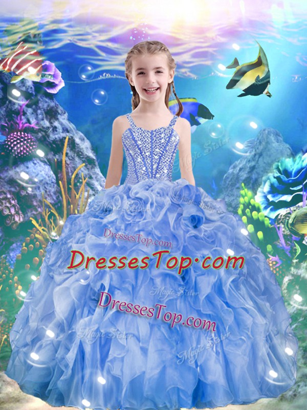 Floor Length Light Blue Pageant Dress for Womens Organza Sleeveless Beading and Ruffles