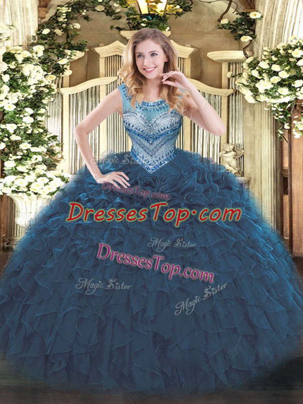 Floor Length Navy Blue Sweet 16 Dress Scoop Sleeveless Lace Up