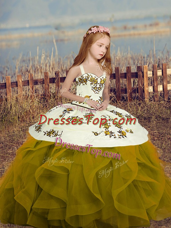 Floor Length Olive Green Pageant Gowns For Girls Sleeveless Embroidery and Ruffles