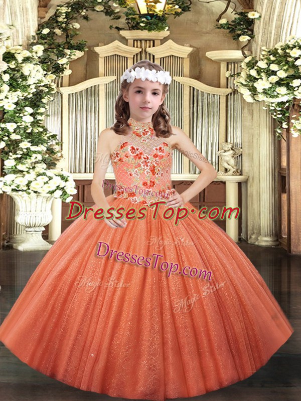 Floor Length Orange Kids Pageant Dress Tulle Sleeveless Appliques