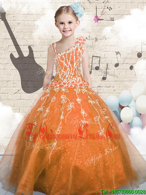 Floor Length Orange Winning Pageant Gowns Tulle Sleeveless Appliques