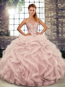 Floor Length Pink 15th Birthday Dress Sweetheart Sleeveless Lace Up