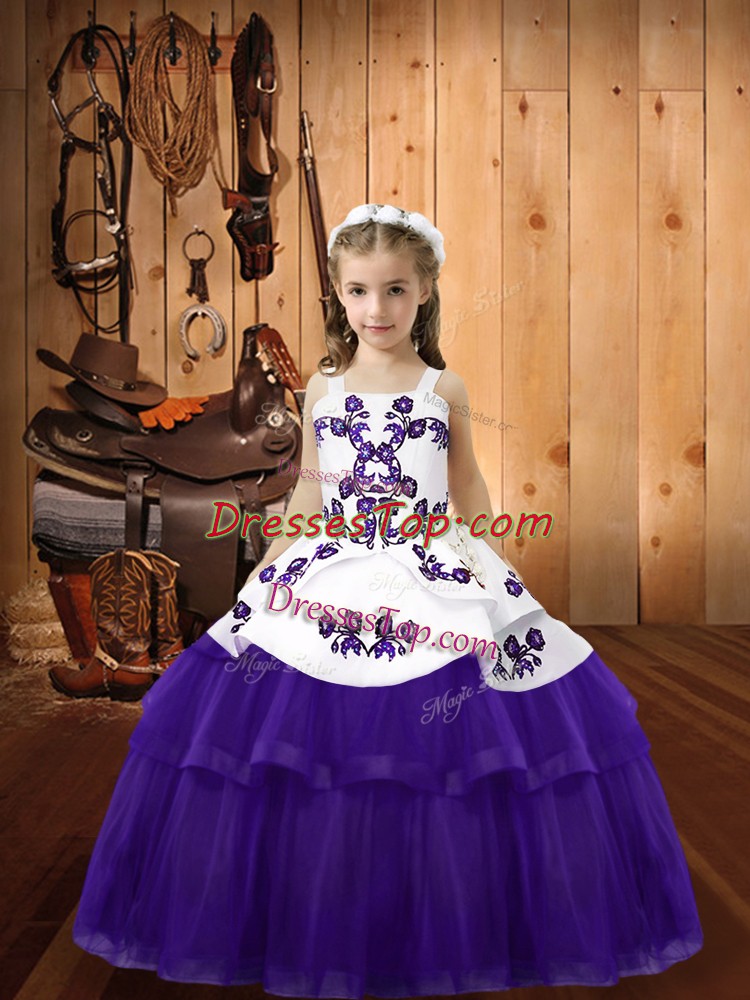 Floor Length Purple Kids Pageant Dress Tulle Sleeveless Embroidery
