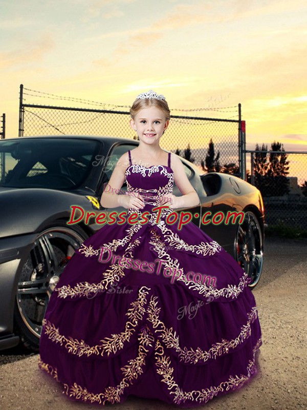 Floor Length Purple Little Girl Pageant Dress Satin Sleeveless Embroidery