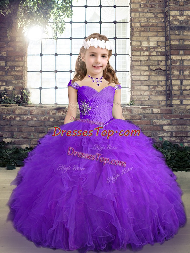 Floor Length Purple Pageant Gowns For Girls Tulle Sleeveless Beading and Ruffles