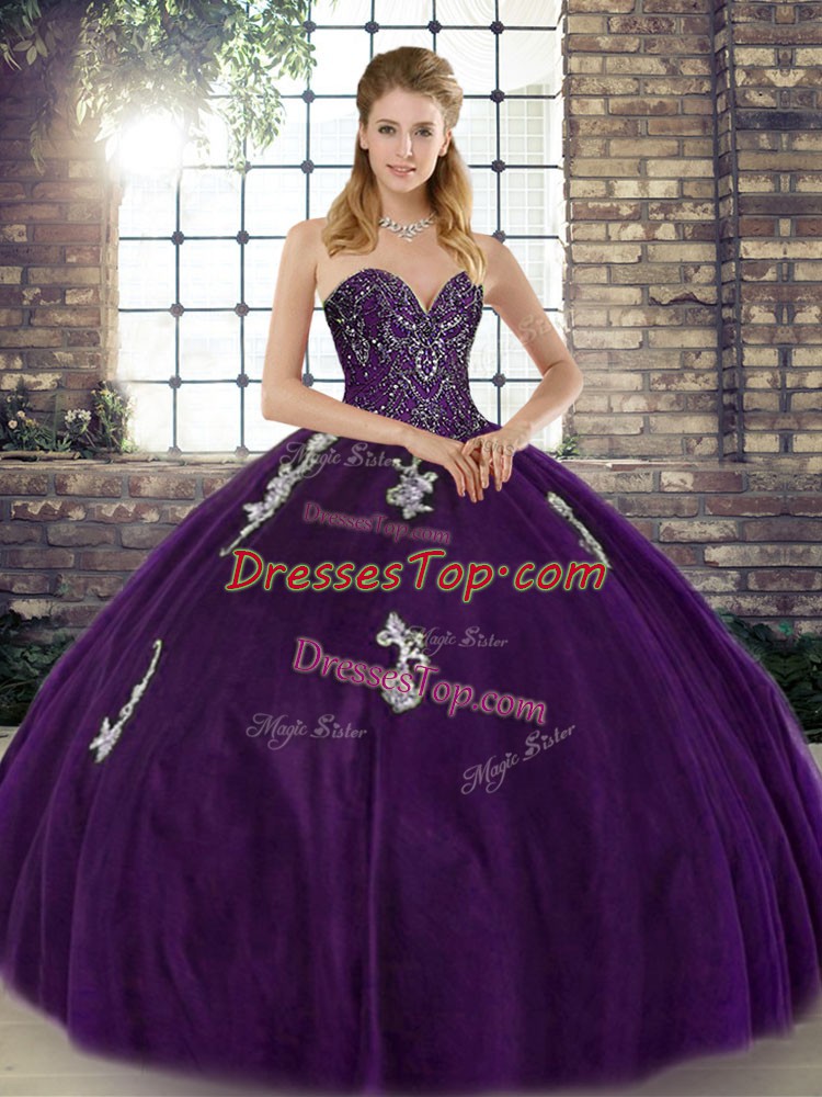 Floor Length Purple Sweet 16 Dresses Tulle Sleeveless Beading and Appliques