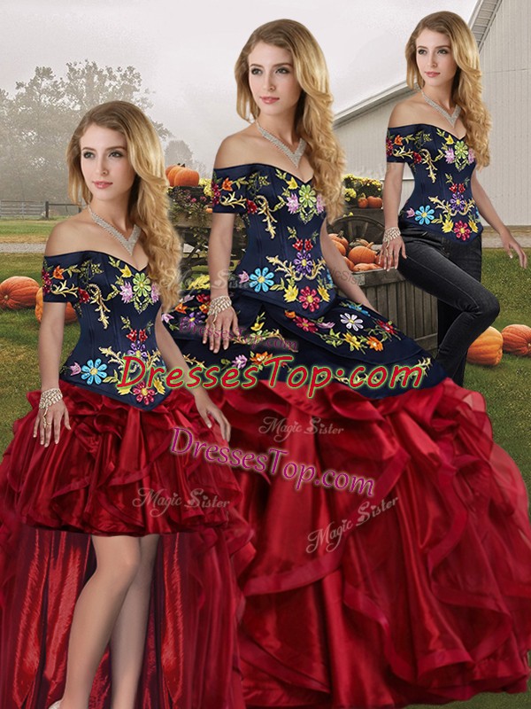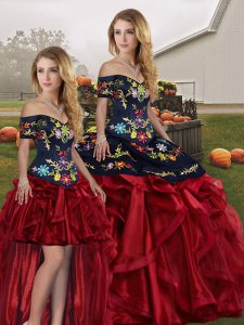 Floor Length Red And Black Quinceanera Gown Off The Shoulder Sleeveless Lace Up