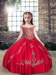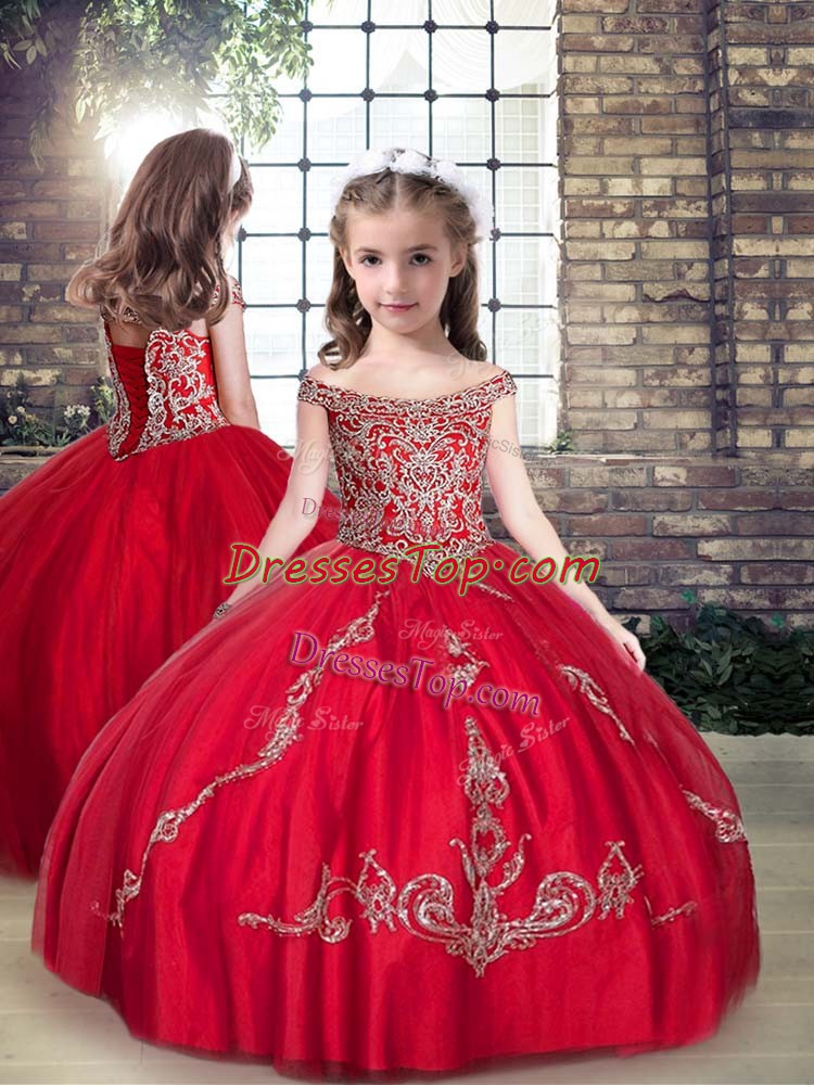 Floor Length Red Little Girl Pageant Gowns Tulle Sleeveless Beading