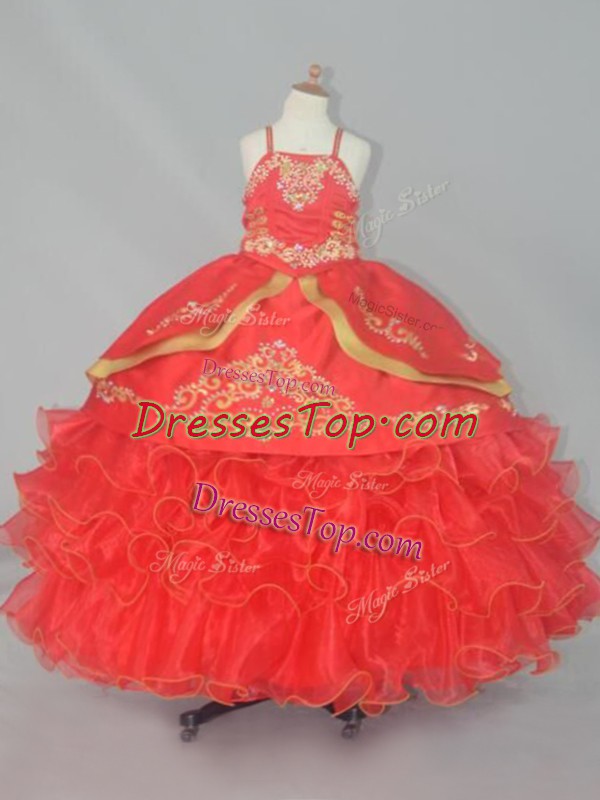 Floor Length Red Little Girls Pageant Dress Wholesale Organza Sleeveless Embroidery and Ruffled Layers