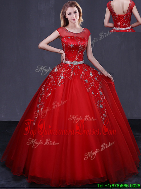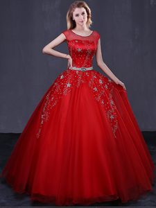 Floor Length Red Vestidos de Quinceanera Scoop Cap Sleeves Lace Up