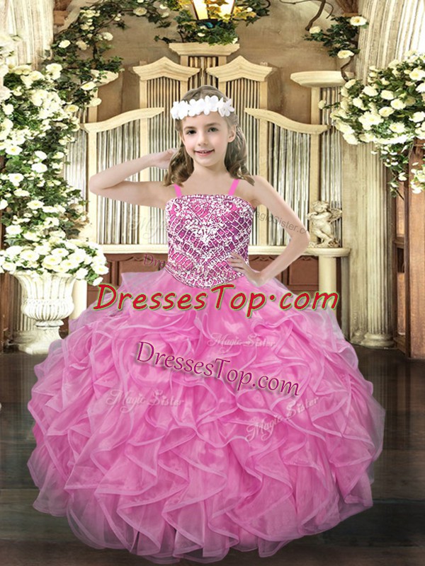 Floor Length Rose Pink Pageant Gowns For Girls Organza Sleeveless Beading and Ruffles