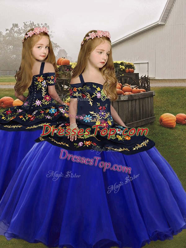 Floor Length Royal Blue Little Girls Pageant Dress Wholesale Organza Sleeveless Embroidery and Ruffles