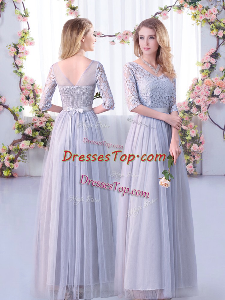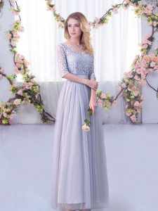 Floor Length Side Zipper Quinceanera Court Dresses Grey for Wedding Party with Lace and Belt