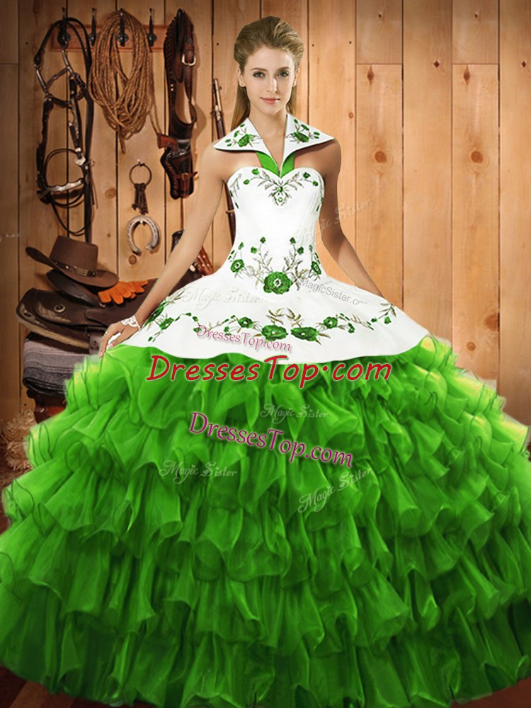 Floor Length Sweet 16 Dresses Satin and Organza Sleeveless Embroidery and Ruffled Layers