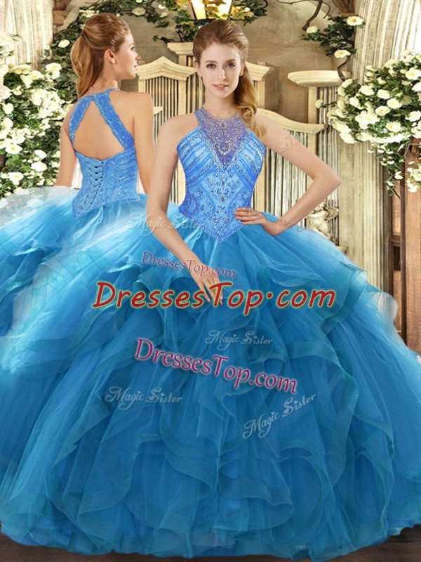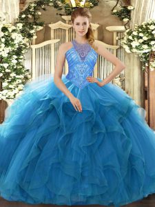 Floor Length Teal Sweet 16 Dress Organza Sleeveless Beading and Ruffles