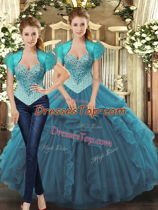Floor Length Teal Vestidos de Quinceanera Tulle Sleeveless Beading and Ruffles