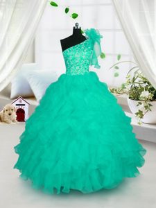 Floor Length Turquoise High School Pageant Dress One Shoulder Sleeveless Lace Up