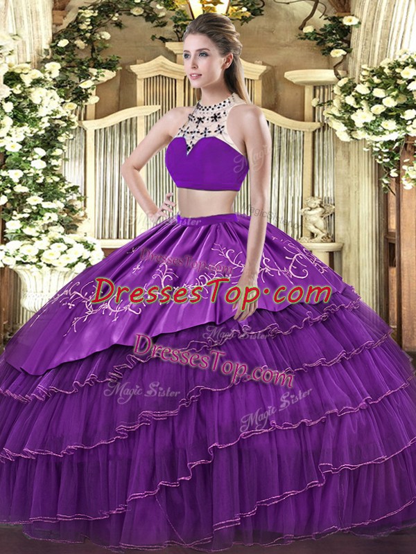 Floor Length Two Pieces Sleeveless Purple Quince Ball Gowns Backless