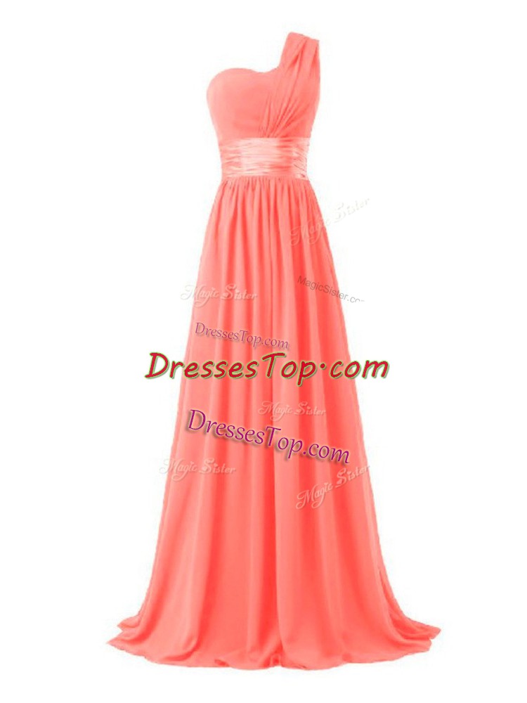Floor Length Watermelon Red Quinceanera Court of Honor Dress One Shoulder Sleeveless Lace Up