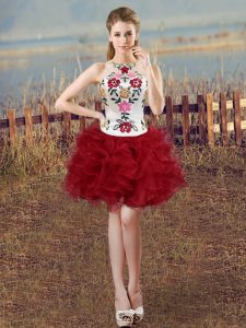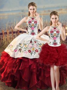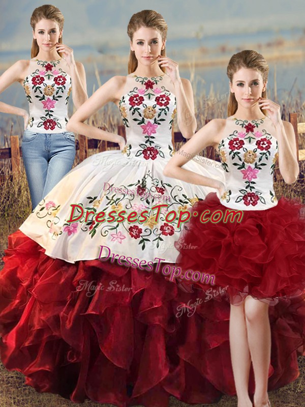 Floor Length White And Red Vestidos de Quinceanera Organza Sleeveless Embroidery and Ruffles