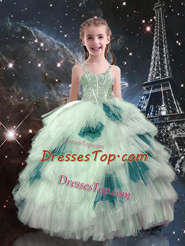 Floor Length White Pageant Gowns Tulle Sleeveless Beading and Ruffled Layers