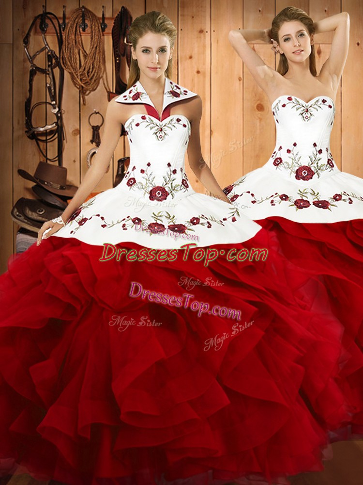 Floor Length Wine Red Quinceanera Dresses Halter Top Sleeveless Lace Up