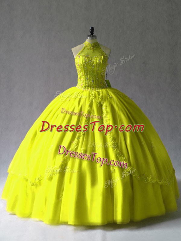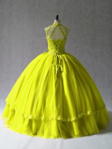 Floor Length Yellow Green 15 Quinceanera Dress Halter Top Sleeveless Lace Up