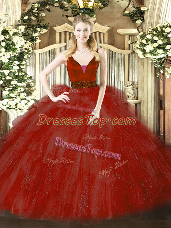 Floor Length Zipper Quinceanera Dress Wine Red for Military Ball and Sweet 16 and Quinceanera with Beading and Ruffles