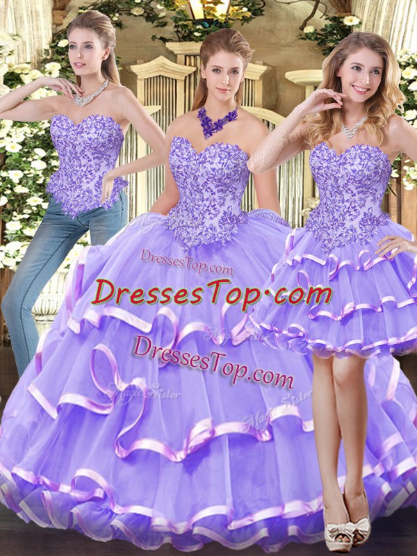 Floor Length Zipper Quinceanera Dresses Lavender for Military Ball and Sweet 16 and Quinceanera with Appliques and Ruffled Layers