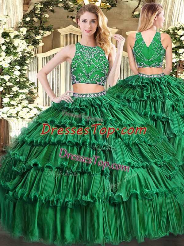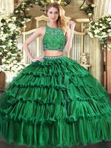 Floor Length Zipper Quinceanera Gown Dark Green for Military Ball and Sweet 16 and Quinceanera with Beading and Appliques and Ruffled Layers