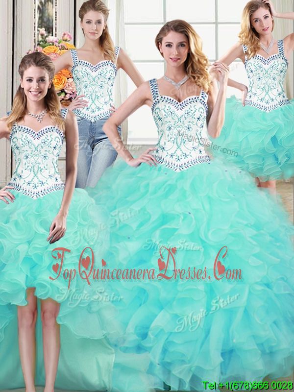 Four Piece Aqua Blue Straps Lace Up Beading and Lace and Ruffles Quinceanera Dress Sleeveless