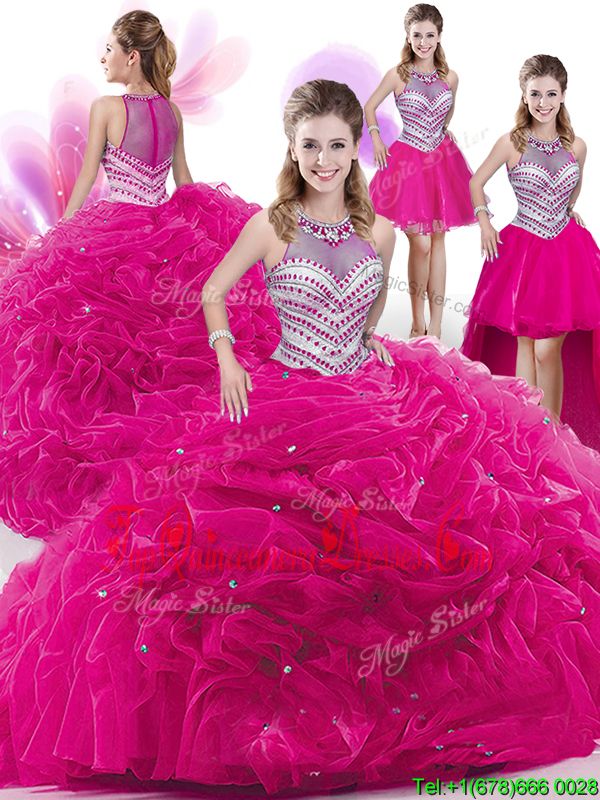 Four Piece Hot Pink Sleeveless Floor Length Beading and Pick Ups Zipper Quince Ball Gowns