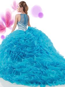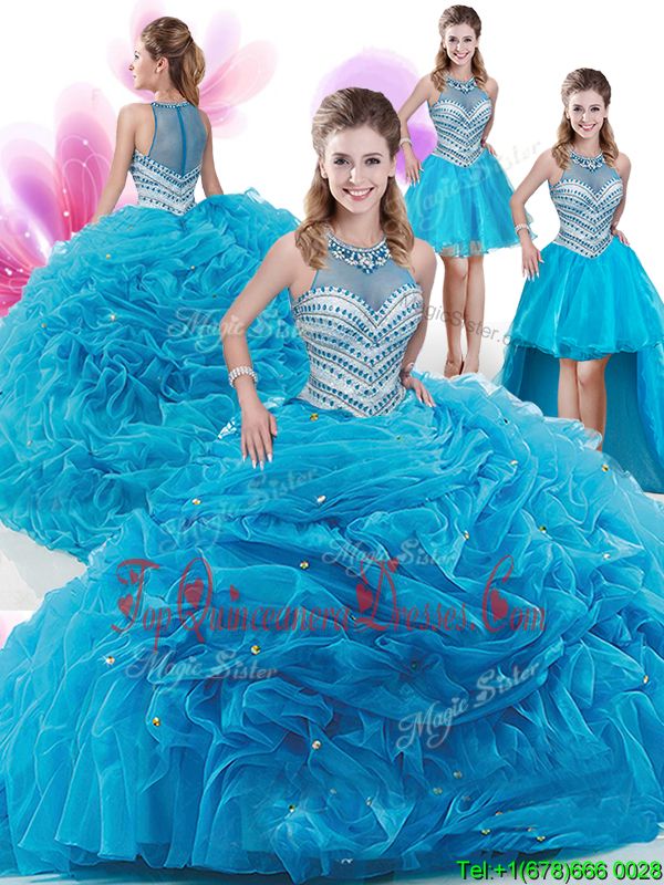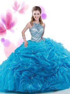 Four Piece Pick Ups Aqua Blue Sleeveless Organza Court Train Zipper Quinceanera Gowns for Military Ball and Sweet 16 and Quinceanera