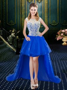 Four Piece Royal Blue Ball Gowns High-neck Sleeveless Tulle Floor Length Brush Train Zipper Lace Quinceanera Dress