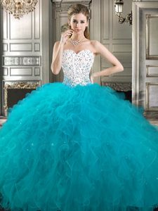 Four Piece Sweetheart Sleeveless Lace Up Vestidos de Quinceanera White and Teal Tulle