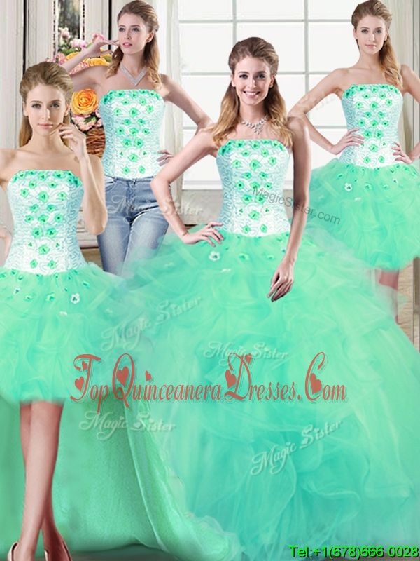Four Piece Turquoise Ball Gowns Beading and Appliques and Ruffles 15th Birthday Dress Lace Up Tulle Sleeveless Floor Length