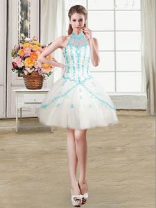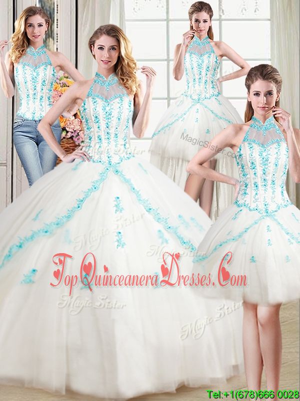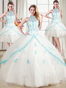 Four Piece White 15 Quinceanera Dress Military Ball and Sweet 16 and Quinceanera and For with Beading and Appliques Halter Top Sleeveless Lace Up