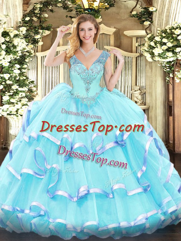 Free and Easy Floor Length Aqua Blue Quinceanera Gowns Organza Sleeveless Ruffled Layers