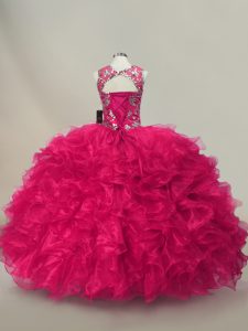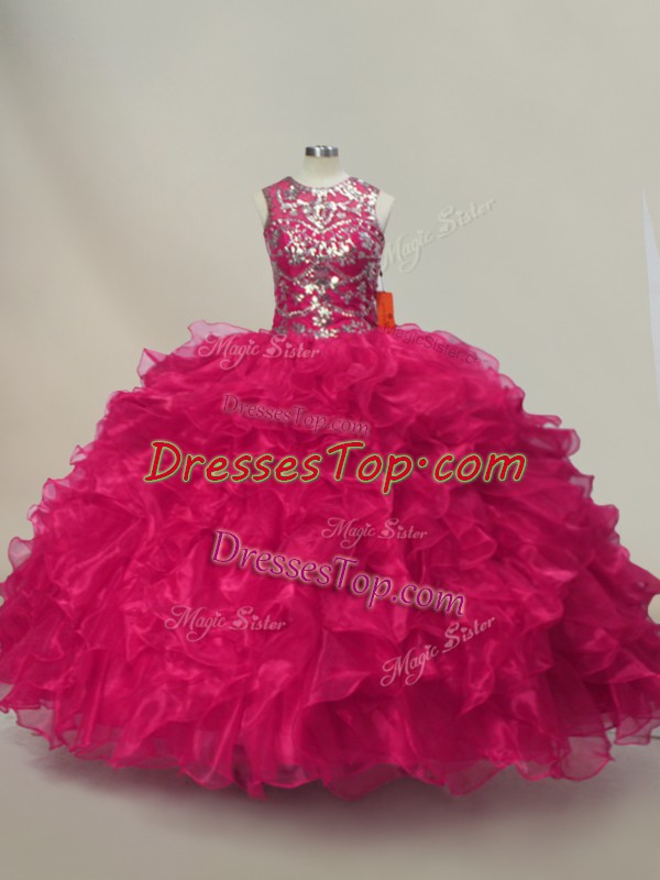 Free and Easy Hot Pink Organza Lace Up 15th Birthday Dress Sleeveless Floor Length Ruffles and Sequins