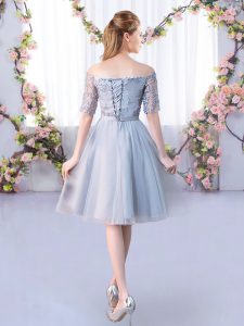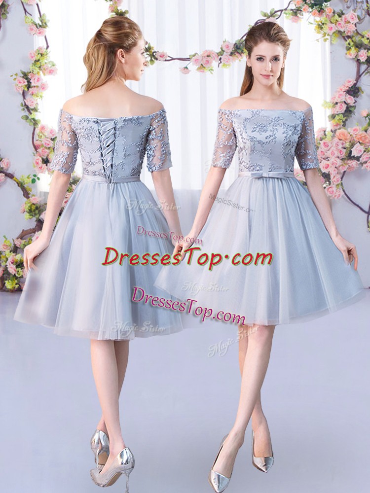 Free and Easy Off The Shoulder Short Sleeves Lace Up Dama Dress for Quinceanera Grey Tulle