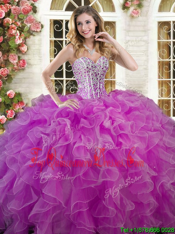 Free and Easy Organza Sweetheart Sleeveless Lace Up Beading and Ruffles Quince Ball Gowns in Lilac