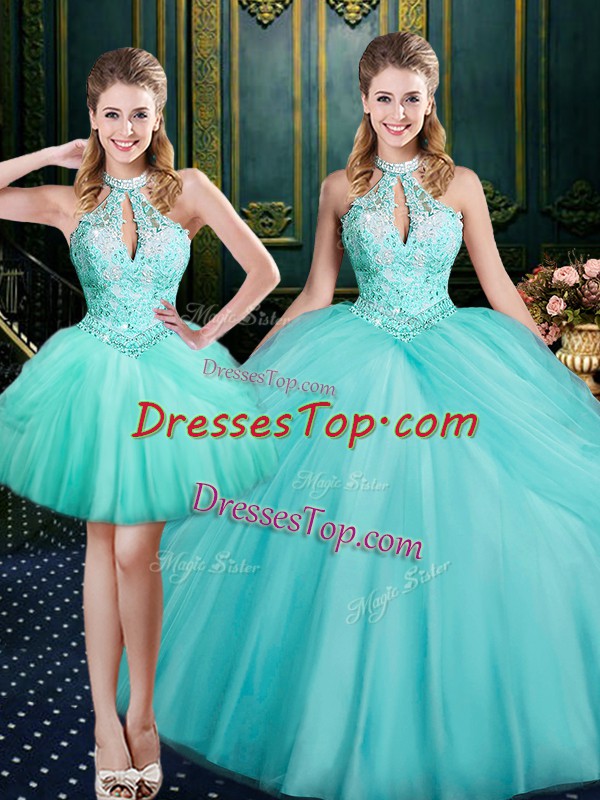 Free and Easy Sleeveless Floor Length Beading and Pick Ups Lace Up Quince Ball Gowns with Aqua Blue